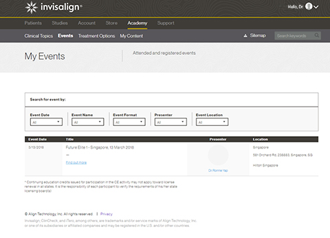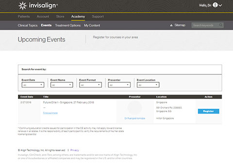 At Align Technology, we are committed to continuously improving your experience as our customer. Therefore in this issue, we are pleased to introduce a new function on our Invisalign® Online Academy on IDS – The Event Registration Page.